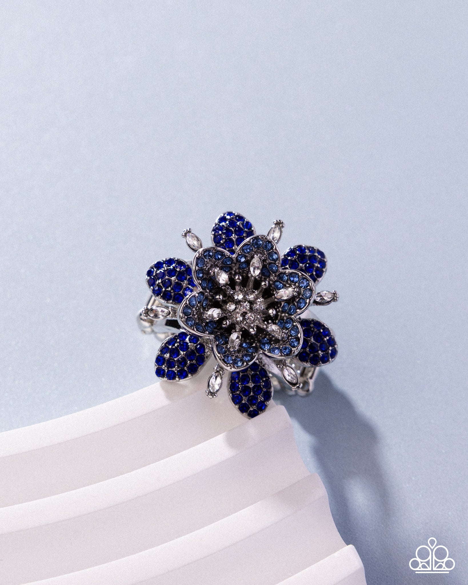 Embellished in white marquise-cut gems, light sapphire and sapphire rhinestones, and silver studs, a layered, three-dimensional silver flower blooms atop airy silver bands atop the finger for a wildly whimsical display. Features a stretchy band for a flexible fit.
