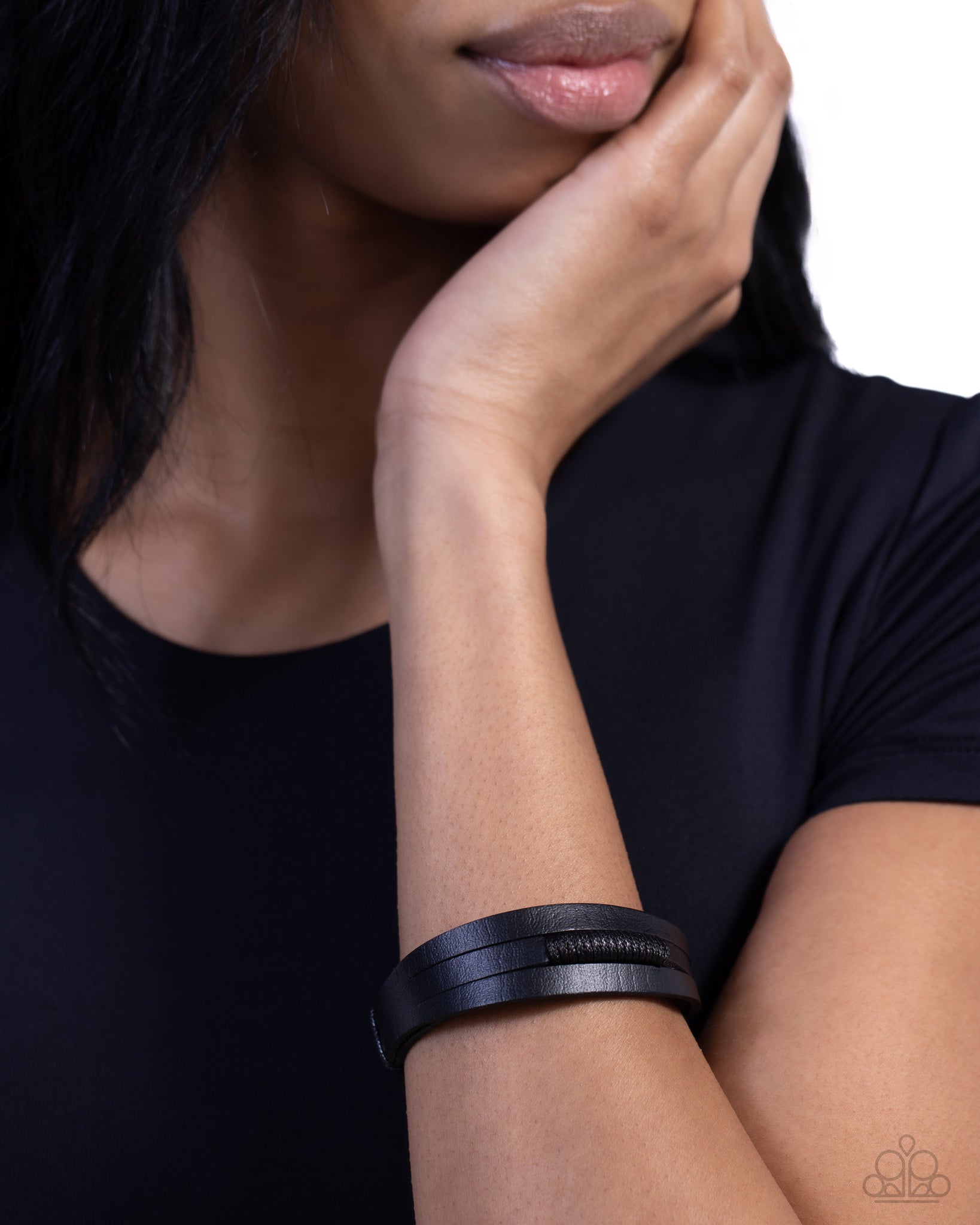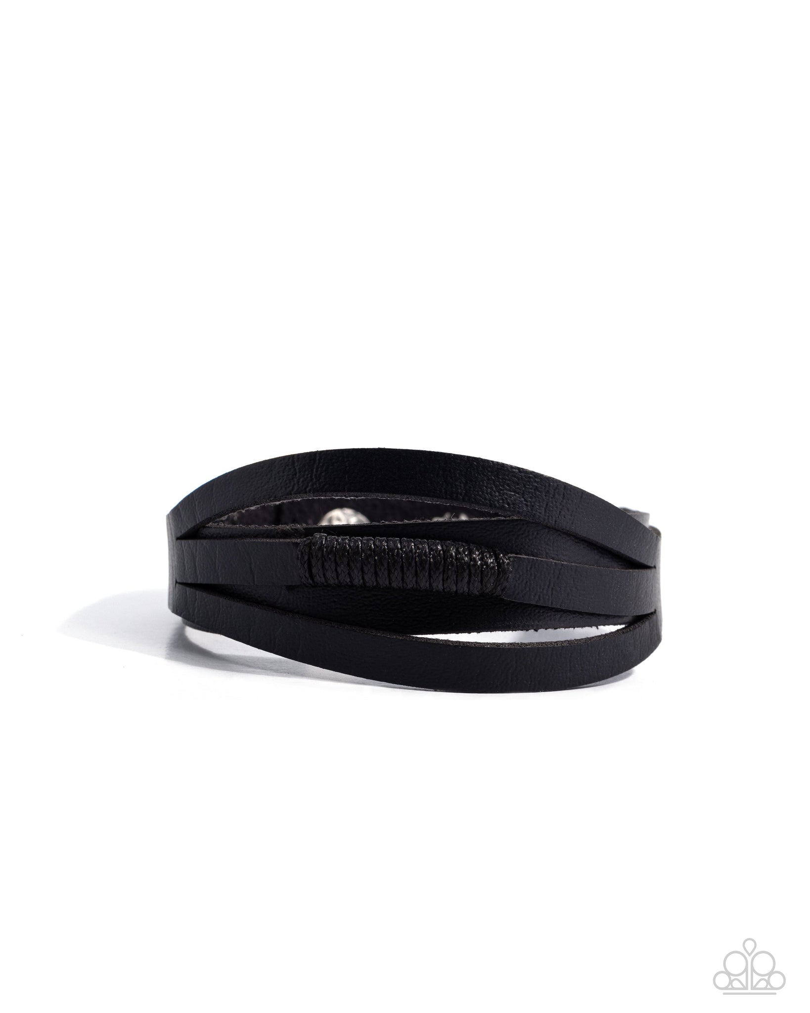 Wrapped in shiny black corded accents, pieces of black leather bands layer around the wrist for a rustic flair. Features an adjustable snap closure.