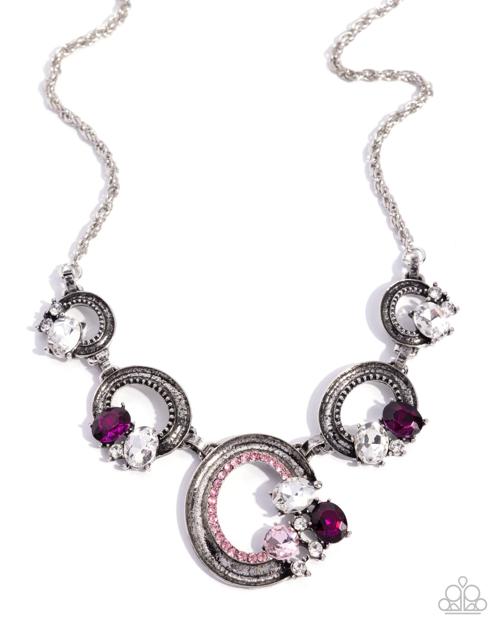 A dainty series of antiqued silver-studded rings are sporadically dotted in chic clusters of white, fuchsia, rose, and light pink rhinestones and gems as they delicately link below the collar, from an antiqued silver rope chain, resulting in an effervescent display. Features an adjustable clasp closure.