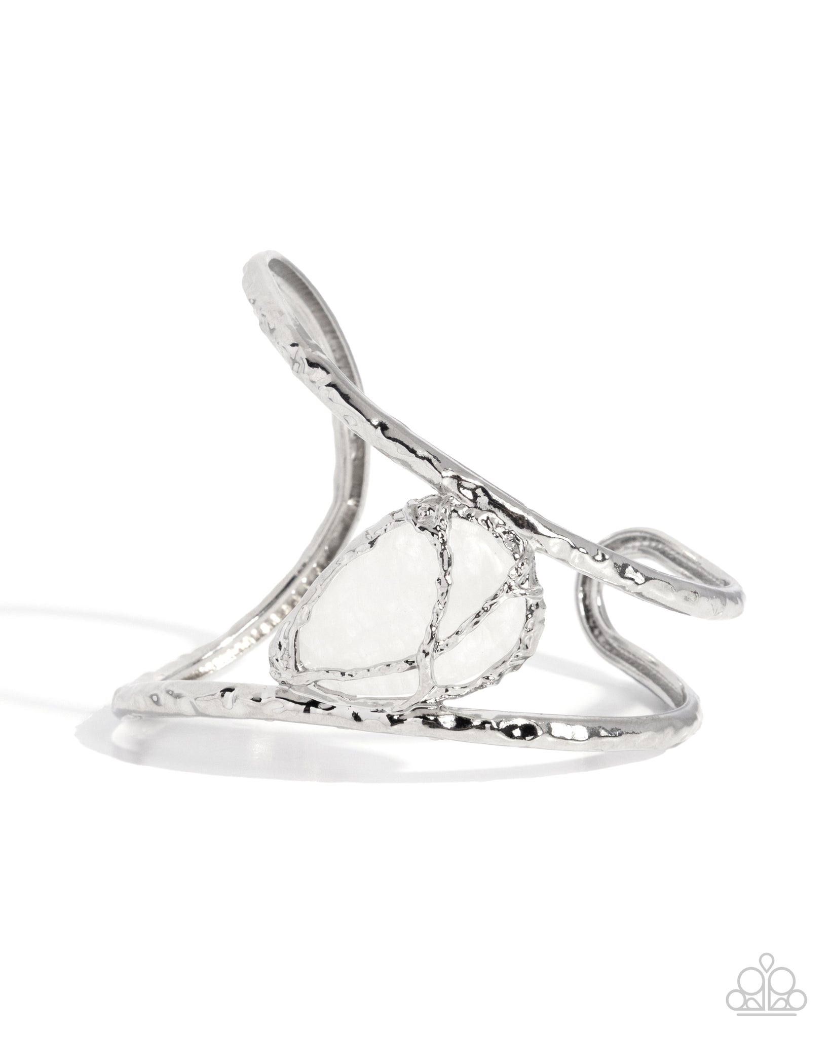 Enveloped along a hammered silver abstract fitting, a chiseled white quartz stone glistens atop an abstract hammered silver band for an eclectically earthy display. As the stone elements in this piece are natural, some color variation is normal.