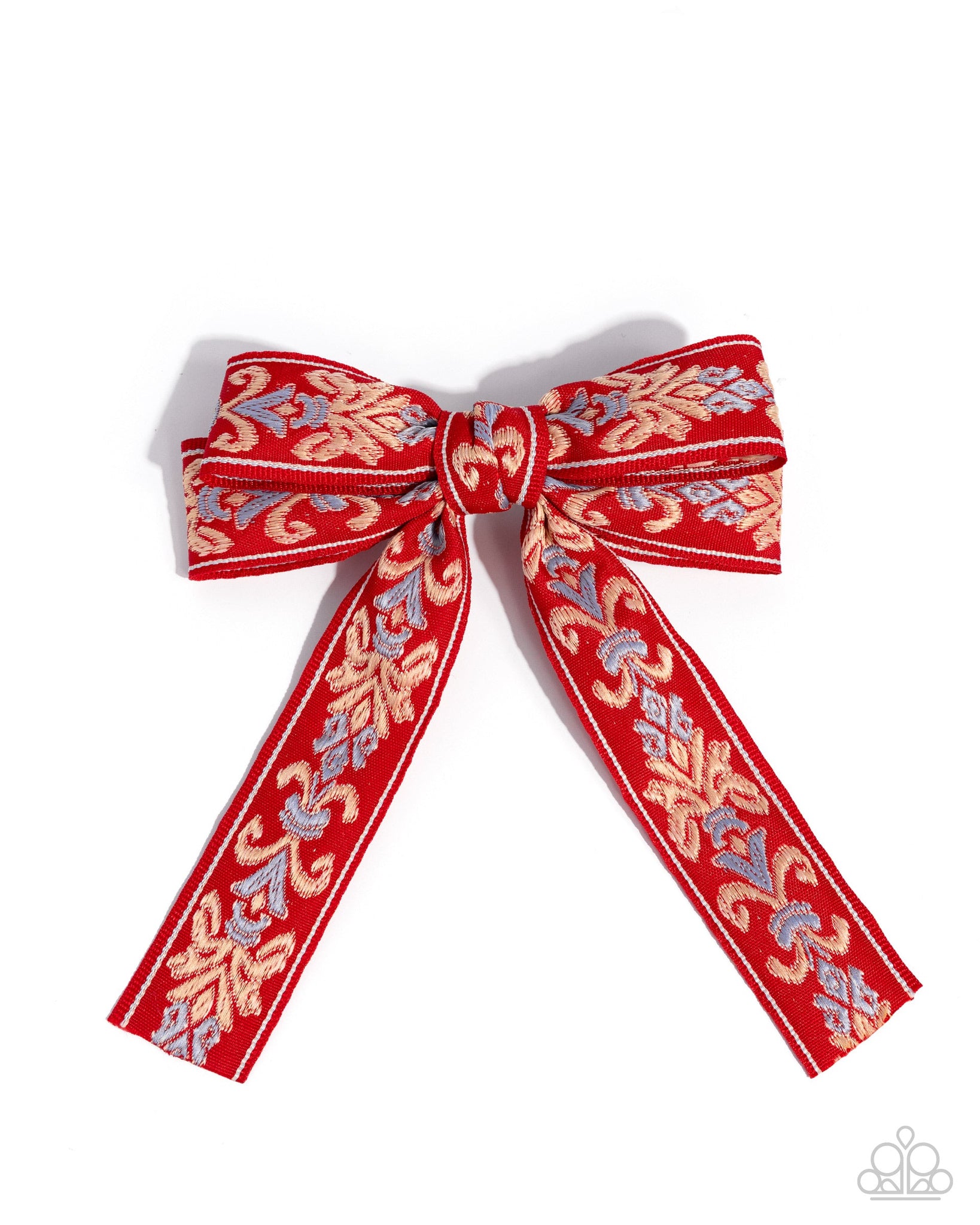 Featuring blue and white vintage European patterns, a layered red ribbon ties into an adorable bow for a Classically-inspired display. Features a standard hair clip on the back.