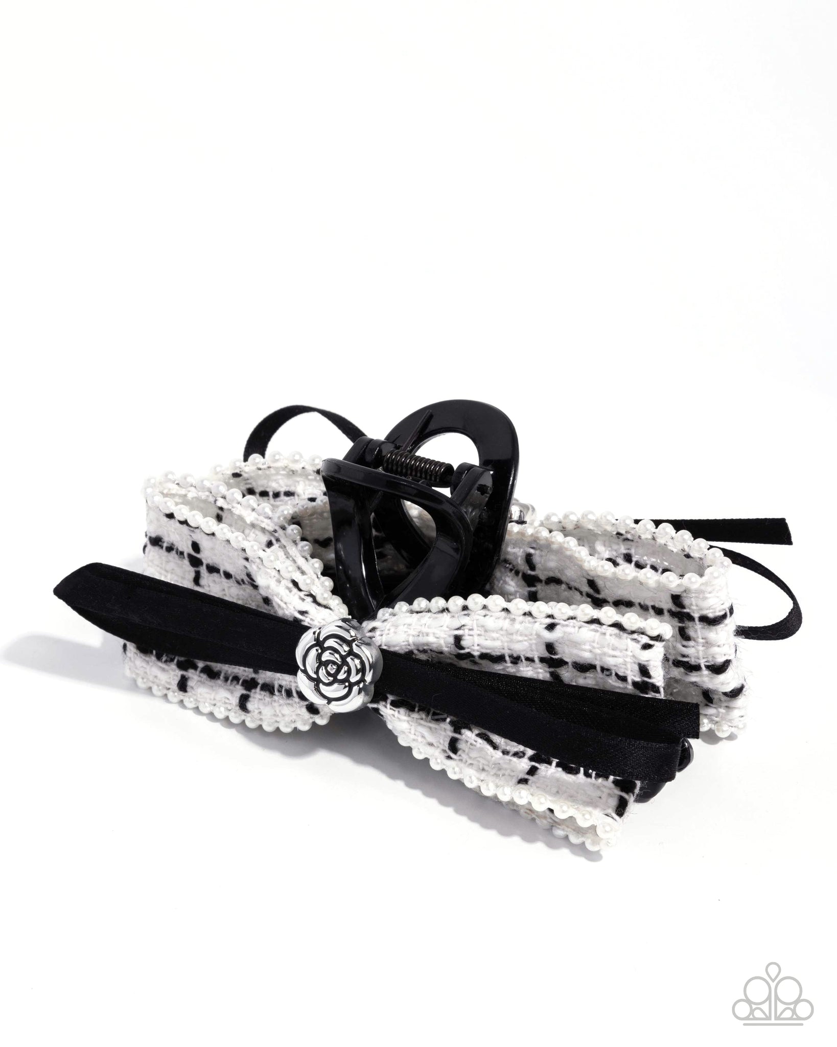 Featuring pearly detailing, a black ribbon tied around a silver rose centerpiece is framed against a white-and-black plaid bow claw clip, holding the hair away from the face for an on-the-go preppy display. Clip measures approximately 2" in length and 4" in width.