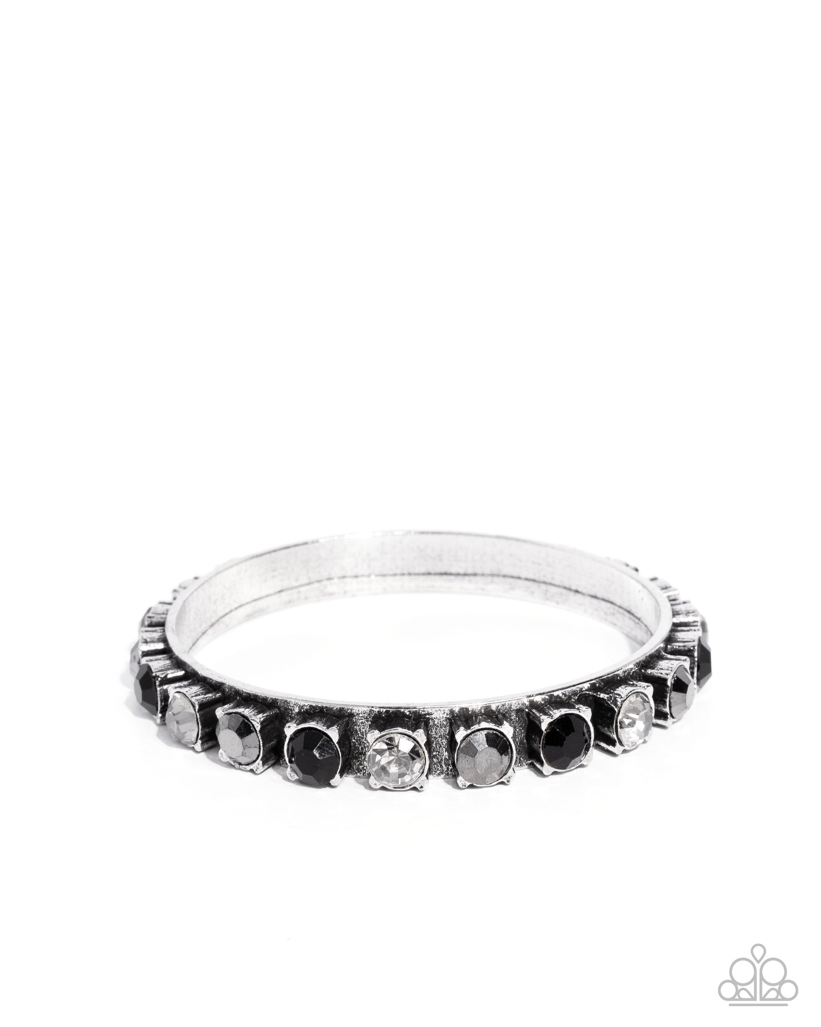 A series of black, smoky, hematite and white rhinestones are set in alternating patterns along a textured silver band, creating a dazzling and vintage-inspired bangle. The subtle antiqued finish adds depth and character to the design, enhancing its bold yet elegant appeal.