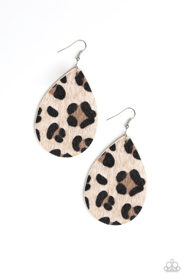 Featuring fuzzy cheetah print, a brown leather teardrop swings from the ear for a wild look. Earring attaches to a standard fishhook fitting.