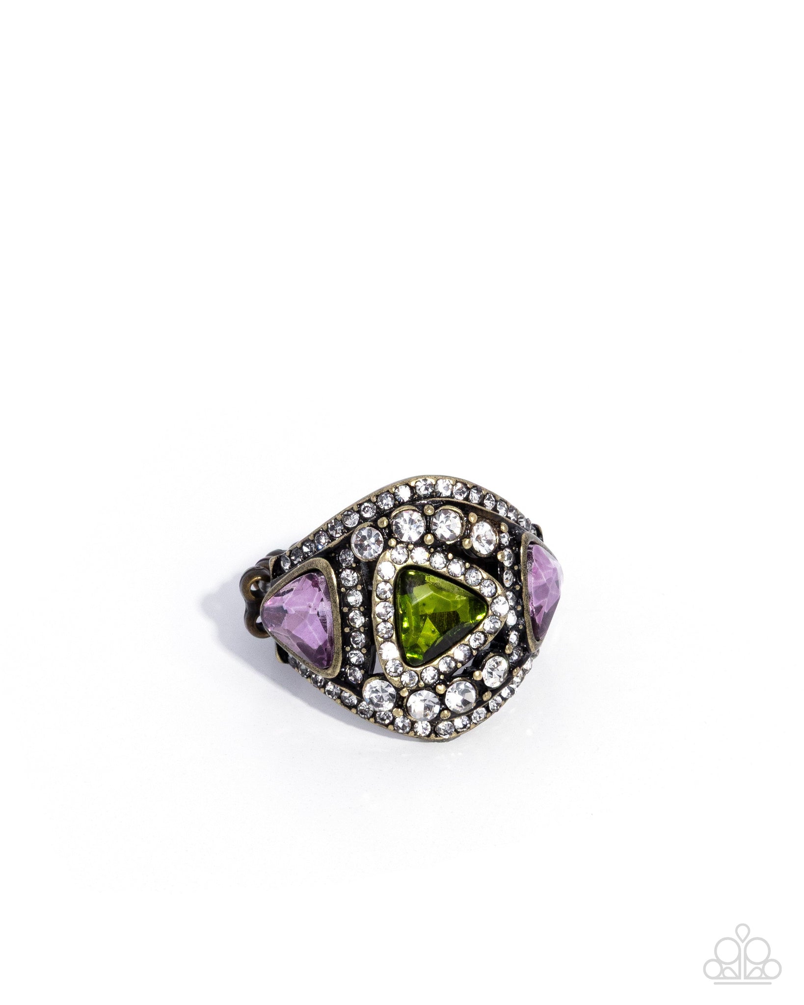 Sporadically dotted with triangular-cut pink and green gems twisted on their sides, a white rhinestone-dusted abstract brass-layered ring stands out atop the finger for a radiantly refulgent centerpiece. Features a stretchy band for a flexible fit.