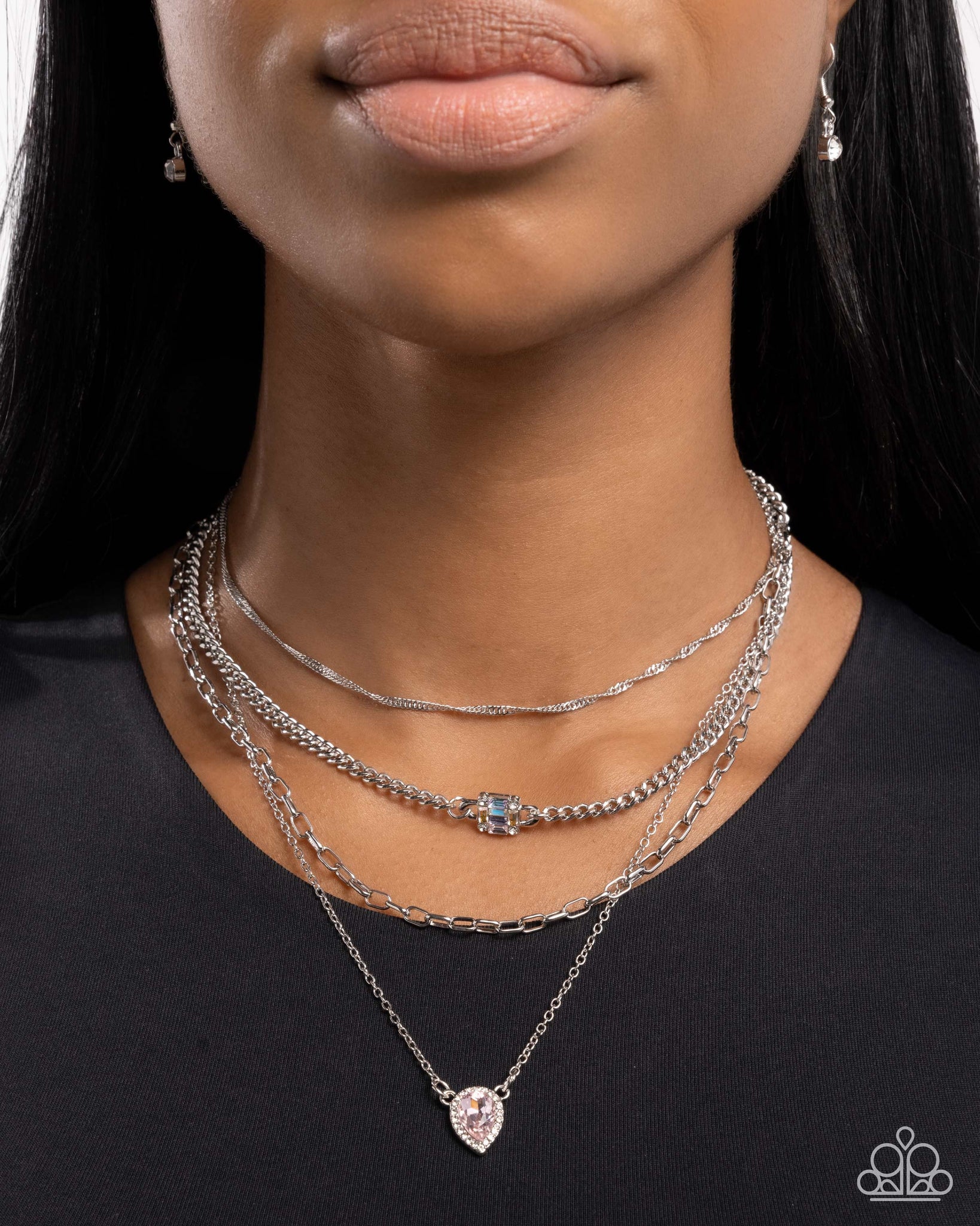 Shimmery mismatched silver singapore, curb, paperclip, and dainty classic chains layer and cascade below the collar. Pressed in a white rhinestone frame, an upside-down pink teardrop gem is centered along the lowermost chain while a three-dimensional pink, purple, and UV-shimmery emerald-cut square pendant with white rhinestones along its corners is featured along the center of the middlemost chain for a shimmery standout finish. Features an adjustable clasp closure.