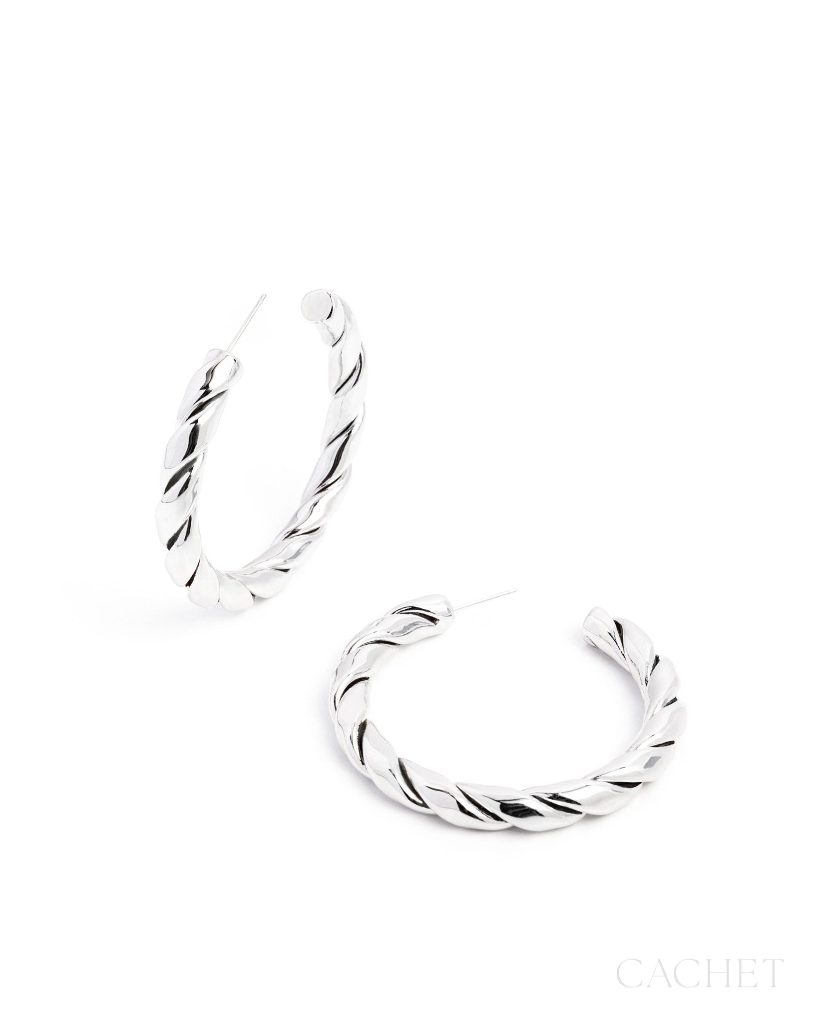 Premium Stainless Steel Base and Rhodium Plating. Earring attaches to a post fitting. Includes a butterfly back and a silicone back with a Rhodium Plated ring around its center for a snug fit. Hoop measures approximately 2" in diameter.