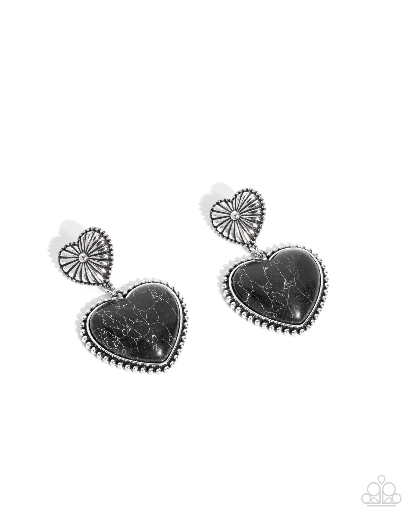 Heart-shaped black stones featuring a veined pattern are bordered by a dotted silver frame, creating a bold and rustic design. The stones dangle from smaller textured heart frames at the top, adding subtle movement and charm. Earring attaches to a standard post fitting. As the stone elements in this piece are natural, some color variation is normal.