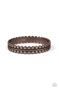 Brushed in an aged finish, an ornately studded copper bangle encircles the wrist as a gorgeous rustic accent.
