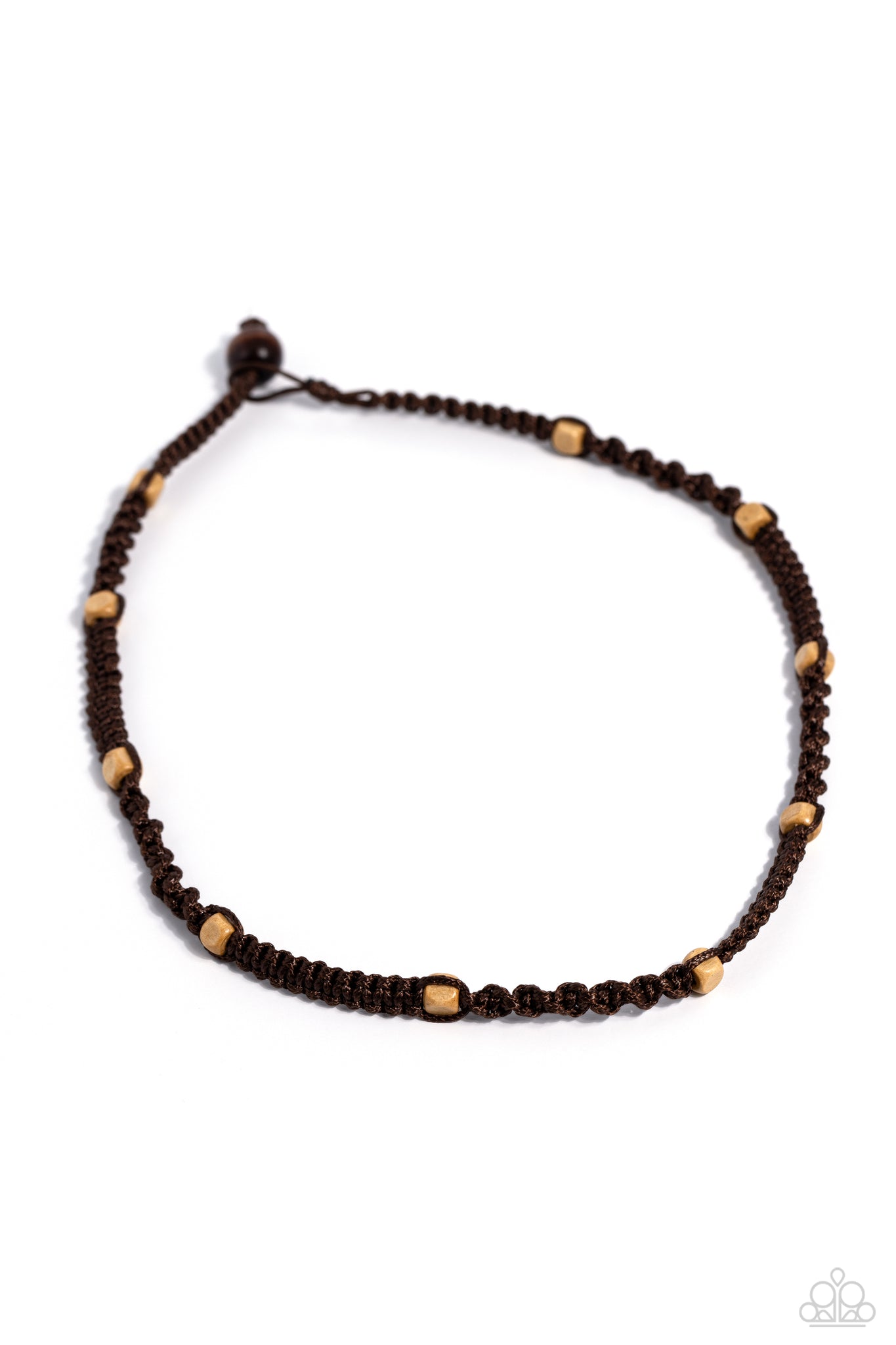 Square wooden bead accents are woven into a rustic brown necklace. The glossy brown cording is knotted into flat and spiral designs for an earthy homespun finish below the collar. Features a button loop closure.