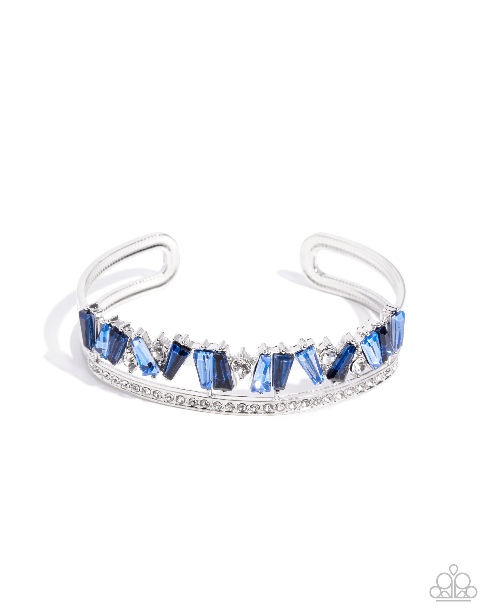 A band of glittery white rhinestones overlaid on a silver bar creates an airy channel-like framework. Baguette-cut blue multicolored gems, in pronged silver fittings, crown the glittery framework beside additional white rhinestones, circling the wrist for a romantically decadent cuff bracelet.