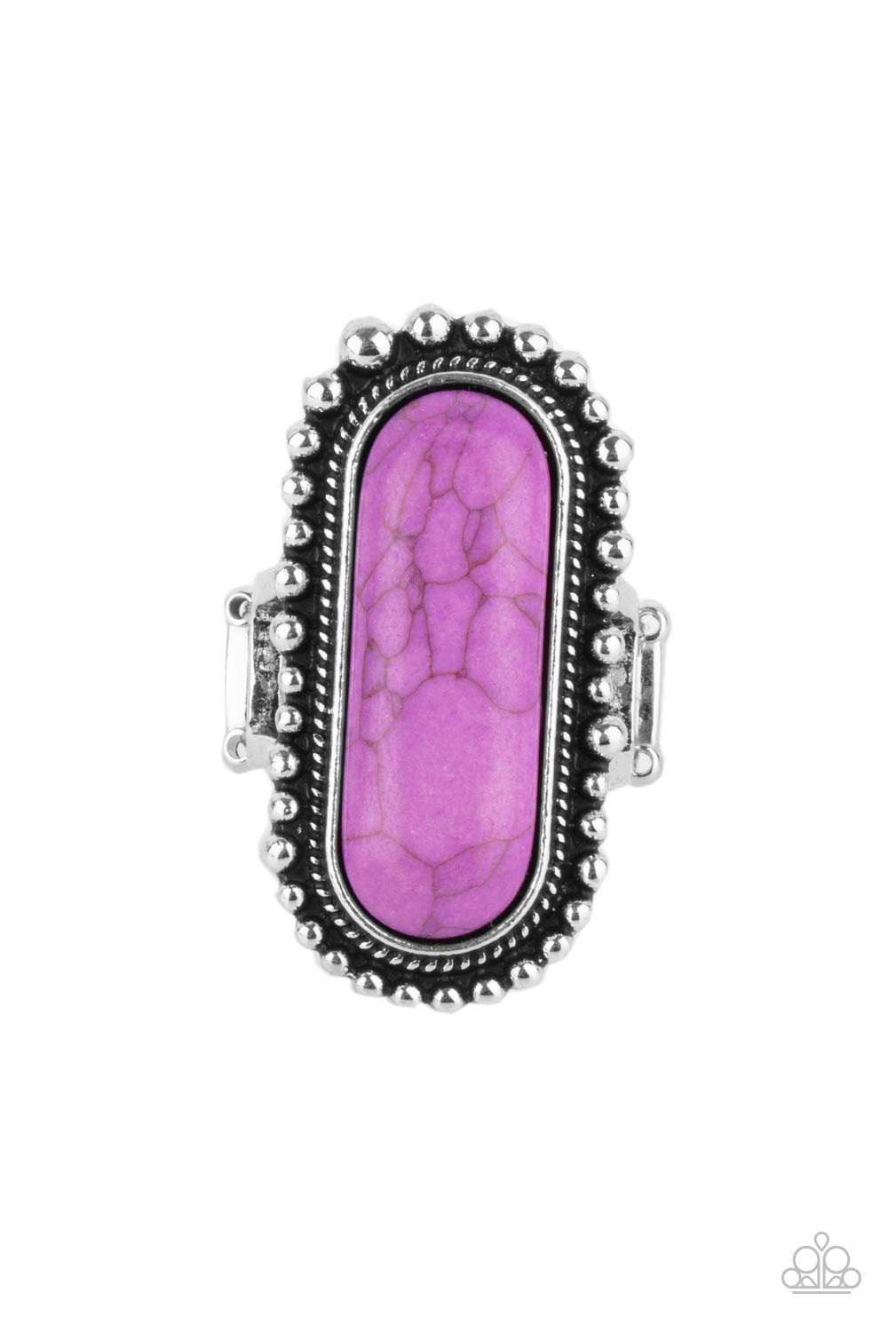 An oblong purple stone is nestled inside an oversized studded silver frame, creating a colorfully rustic centerpiece atop the finger. Features a stretchy band for a flexible fit.