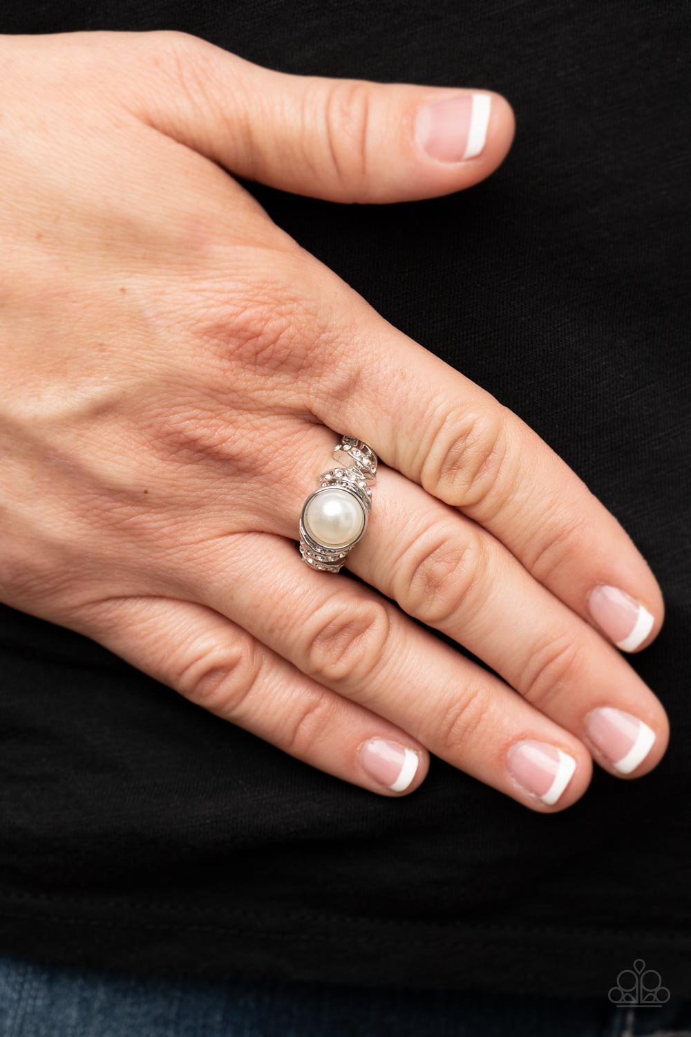 Enhanced with a bubbly white pearl centerpiece, ribbons of white rhinestone encrusted silver bands twirl across the finger for a timeless twist. Features a dainty stretchy band for a flexible fit.
