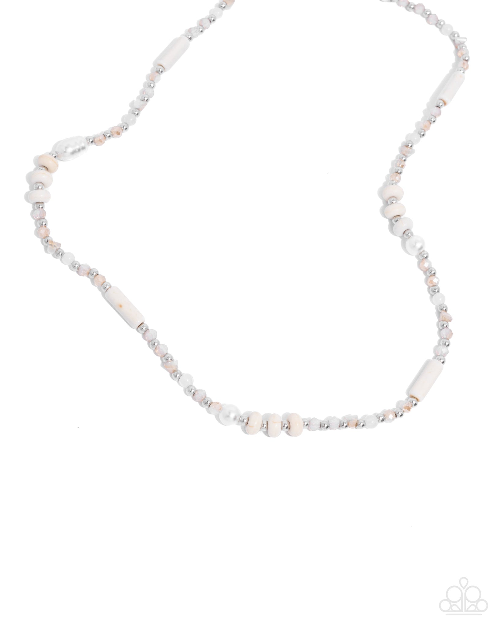 Infused on an invisible string, a collection of silver beads, white pearls, white stone beads in various shapes, UV shimmery-brushed beads, and chiseled faceted beads whimsically pattern and extend below the neckline for an eclectically earthy, elegant look. Features an adjustable clasp closure. As the stone elements in this piece are natural, some color variation is normal.