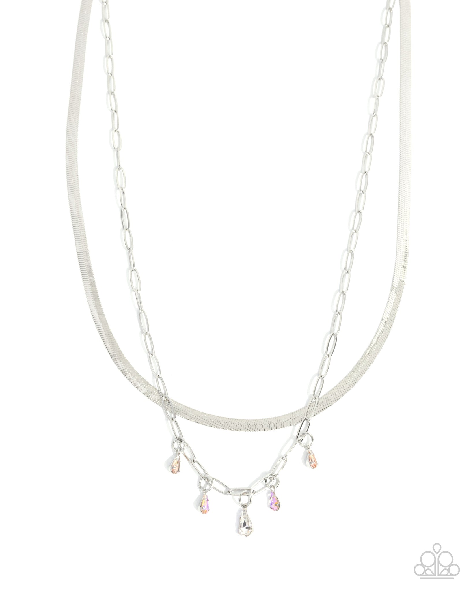 Pressed in pronged, silver frames, a collection of dainty white, orange, and orange iridescent teardrop gems sway from a silver paperclip chain that joins a silver herringbone chain for a luminescent layered look. Features an adjustable clasp closure. Due to its prismatic palette, color may vary.