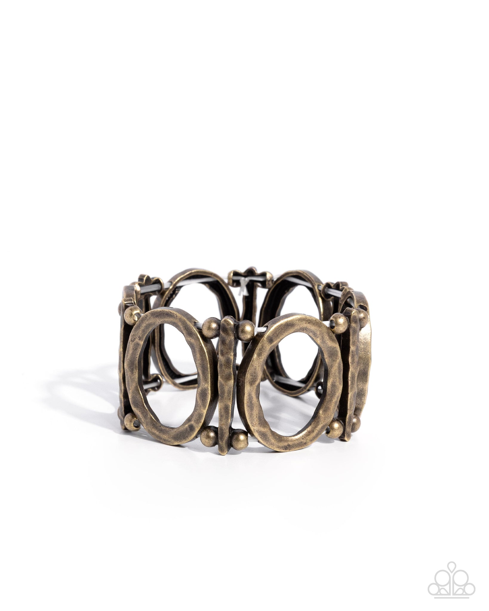 Infused along elastic stretchy bands, a collection of hammered, thin brass bars alternate with brass hammered ovals between brass beads along the wrist for a whimsically weathered look.