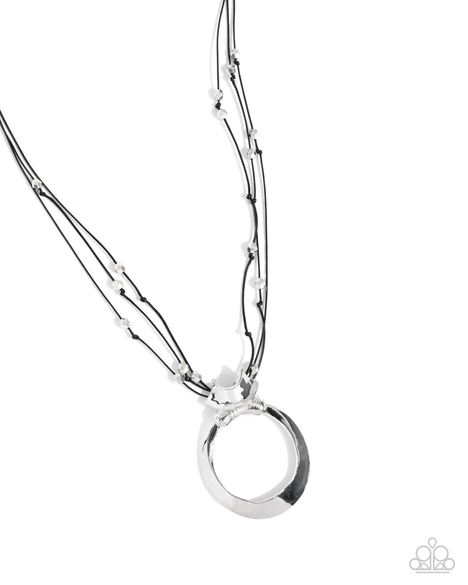 Infused along a trio of black cording, faceted silver beads sporadically coalesce along the neckline, leading the eye to an oversized silver ring pendant with an abstract bail for a sensationally seasonal display. Features an adjustable clasp closure.