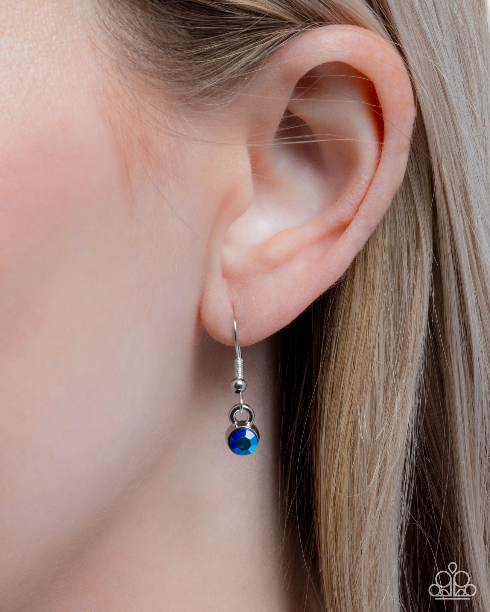 Shiny silver frames fan out into scalloped patterns, creating an airy and vintage-inspired design. Each frame cradles a faceted UV blue teardrop gem encircled by a ring of glistening blue-iridescent rhinestones, adding an elegant shimmer. The frames are connected to a paperclip silver chain, completing the bold and timeless piece. Features an adjustable clasp closure.
