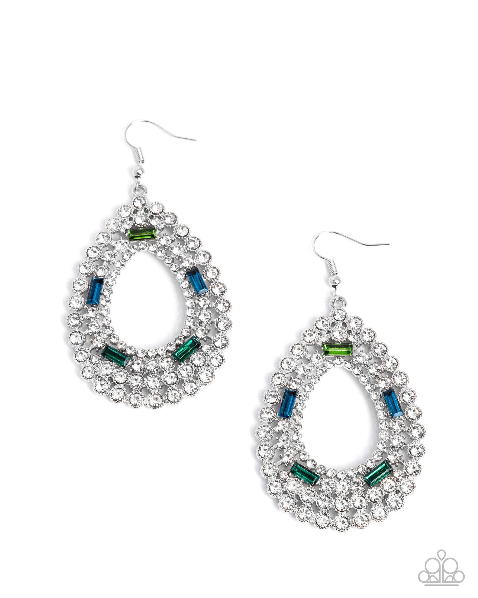 Rings of glittery white rhinestones collect into a blinding teardrop frame for a dramatically glamorous fashion. A quintet of emerald-cut emerald, light green, and blue gems alternate along the centermost of white rhinestones for additional chic color. Earring attaches to a standard fishhook fitting.