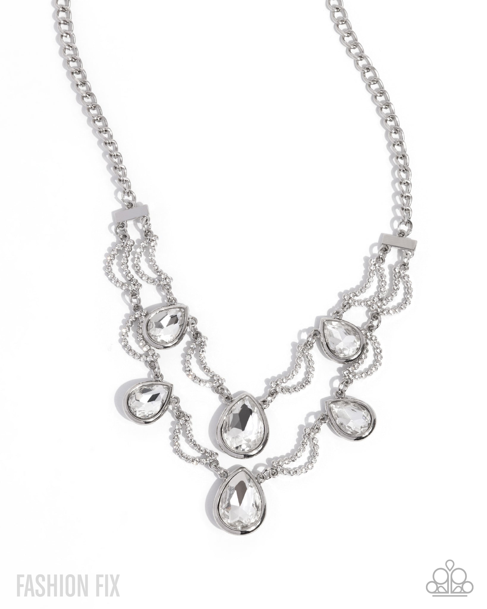 A decadent collection of teardrop white gems in varying sizes, alternating with draped dainty white rhinestones in silver fittings, interlock and gather below the neckline from silver fittings connected to a classic silver chain, creating a timeless twinkly showcase. Features an adjustable clasp closure.