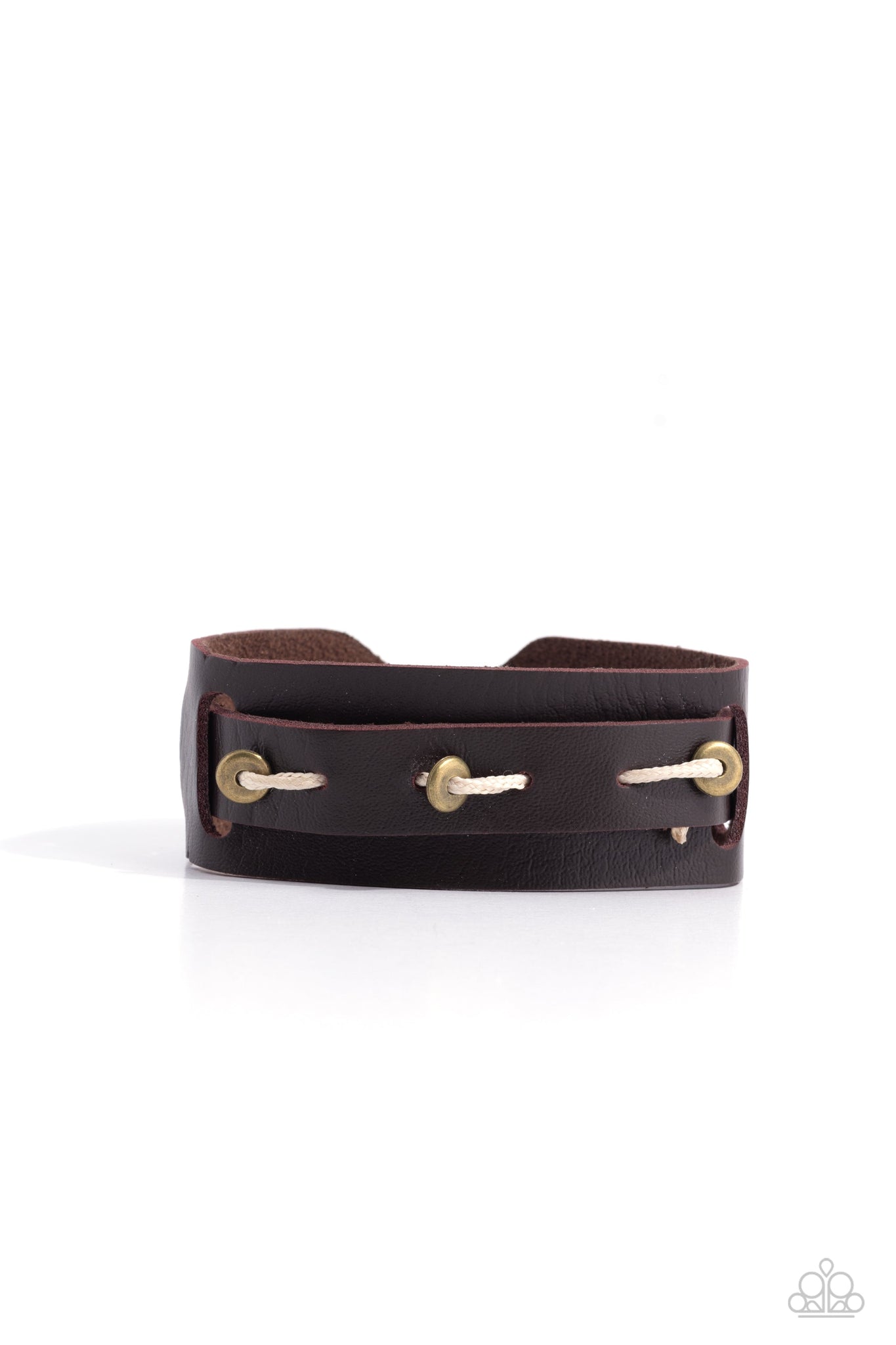 Rustic brass discs are threaded along a white cord that is threaded through a piece of brown leather studded in place across the front of a thick leather band, resulting in a gritty effect around the wrist. Features an adjustable snap closure.