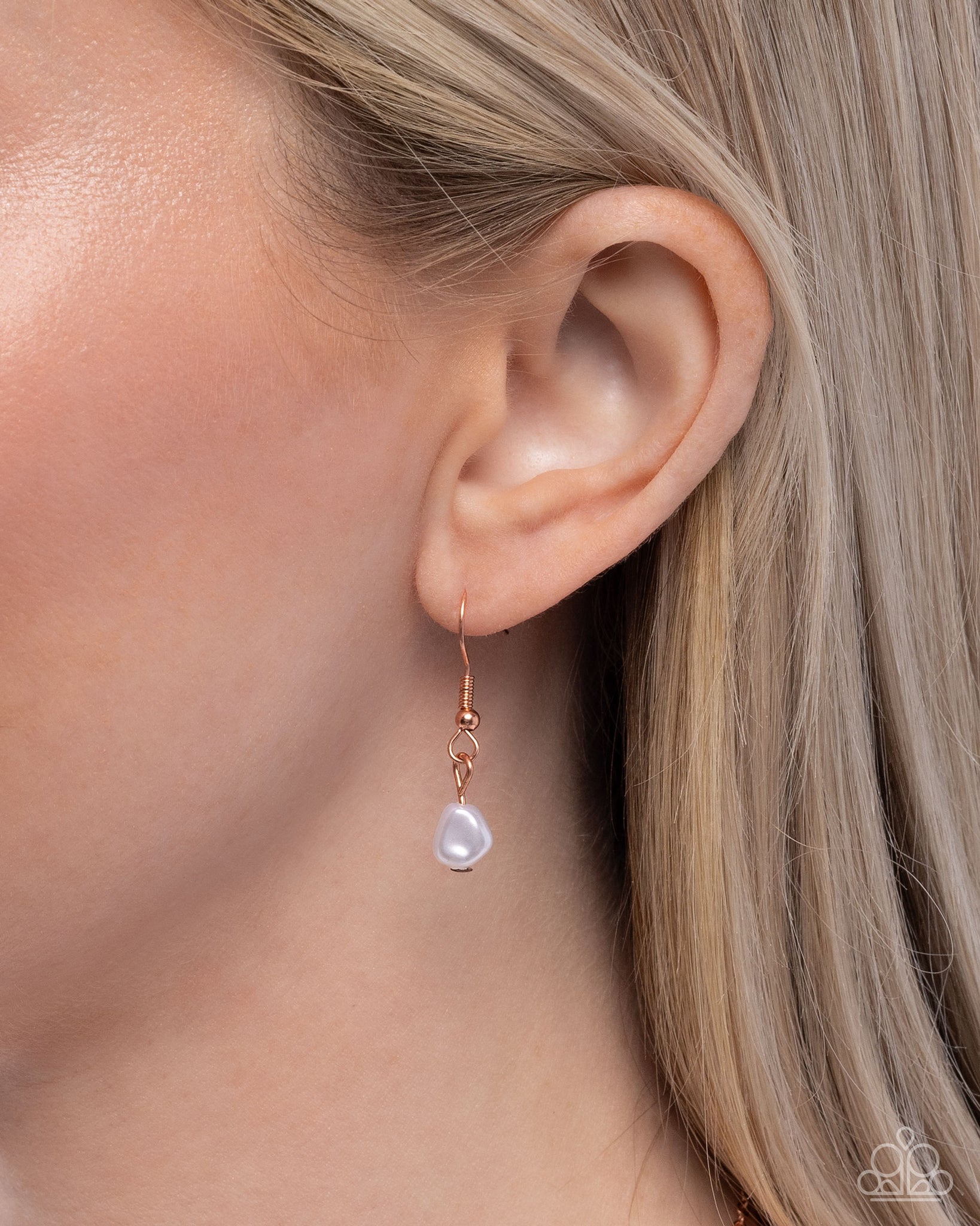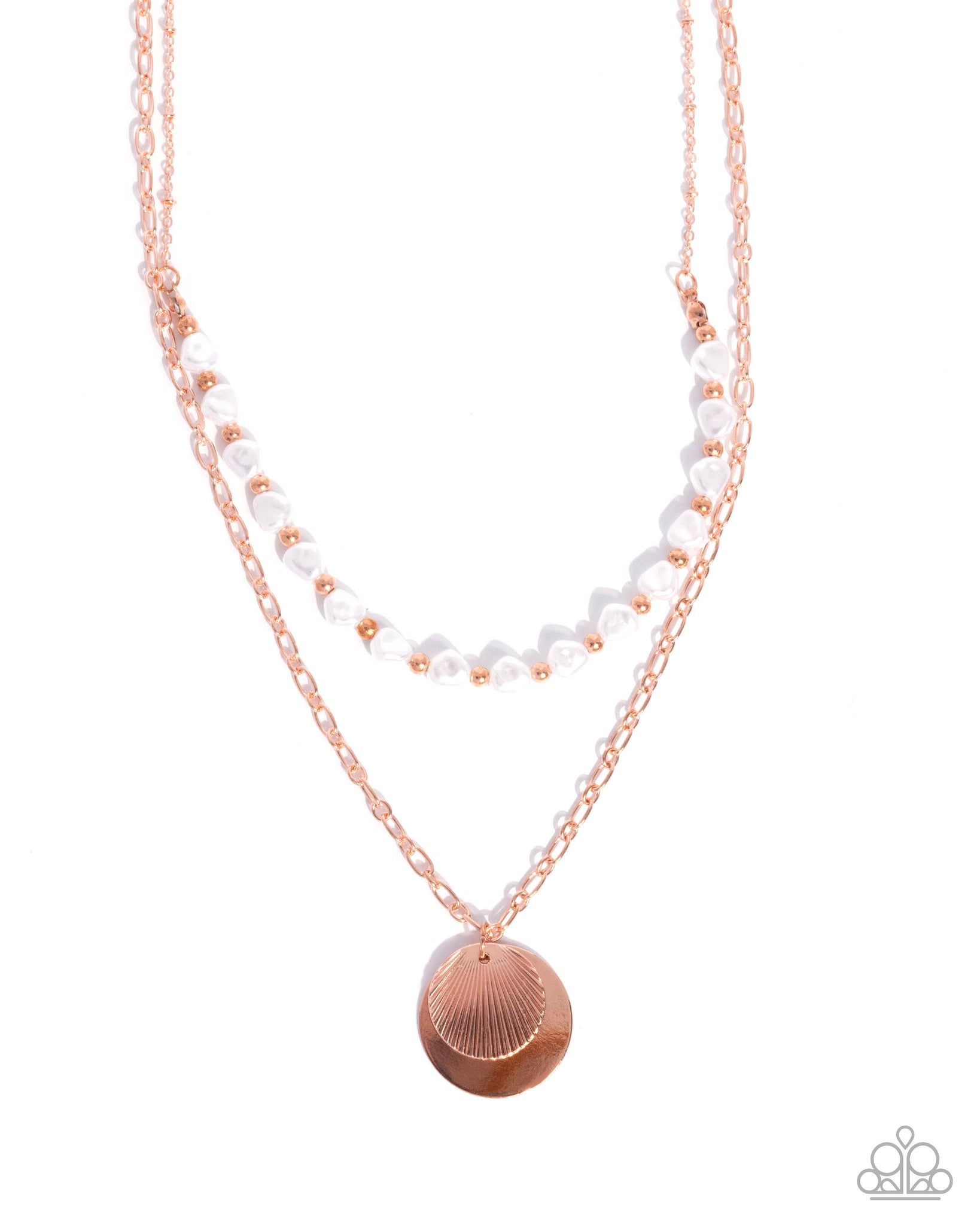 Two strands of shiny copper chains, accented with a row of lustrous white pearls, rests below the collar. The bottom strand is adorned with a polished shiny copper shell-shaped disc, and a smooth shiny copper disc, creating a radiant and beach-inspired look. Features an adjustable clasp closure.