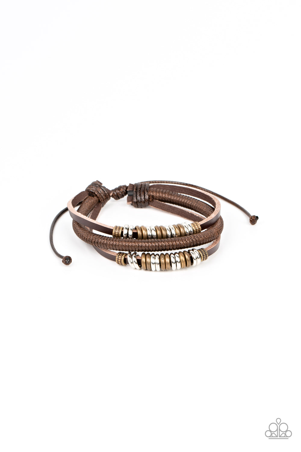 Infused with sections of smooth and textured brass and silver rings, a pair of brown leather bands joins a strand of spun brown cording around the wrist, resulting in rustic layers. Features an adjustable sliding knot closure.