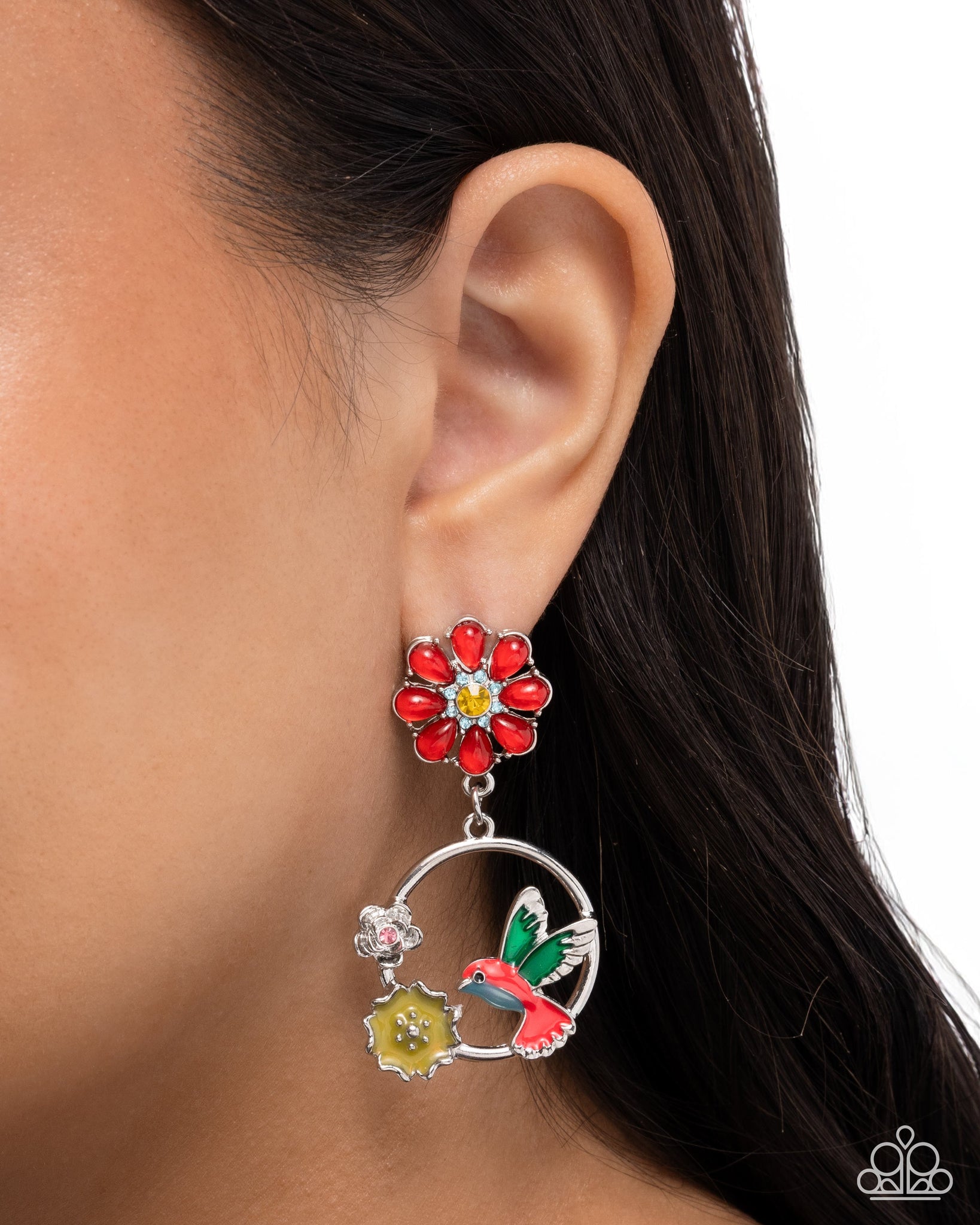 Featuring a yellow rhinestone center surrounded by a border of blue rhinestones, a collection of teardrop milky Poppy Red petals flare out below the ear for a floral centerpiece. Dotted with a rose rhinestone, a three-dimensional silver flower, Primrose-painted crimped flower, and a silver hummingbird with a Poppy Red body, emerald wings, and turquoise body are perched atop a silver ring that sways below the flower for a whimsical finish. Earring attaches to a standard post fitting.