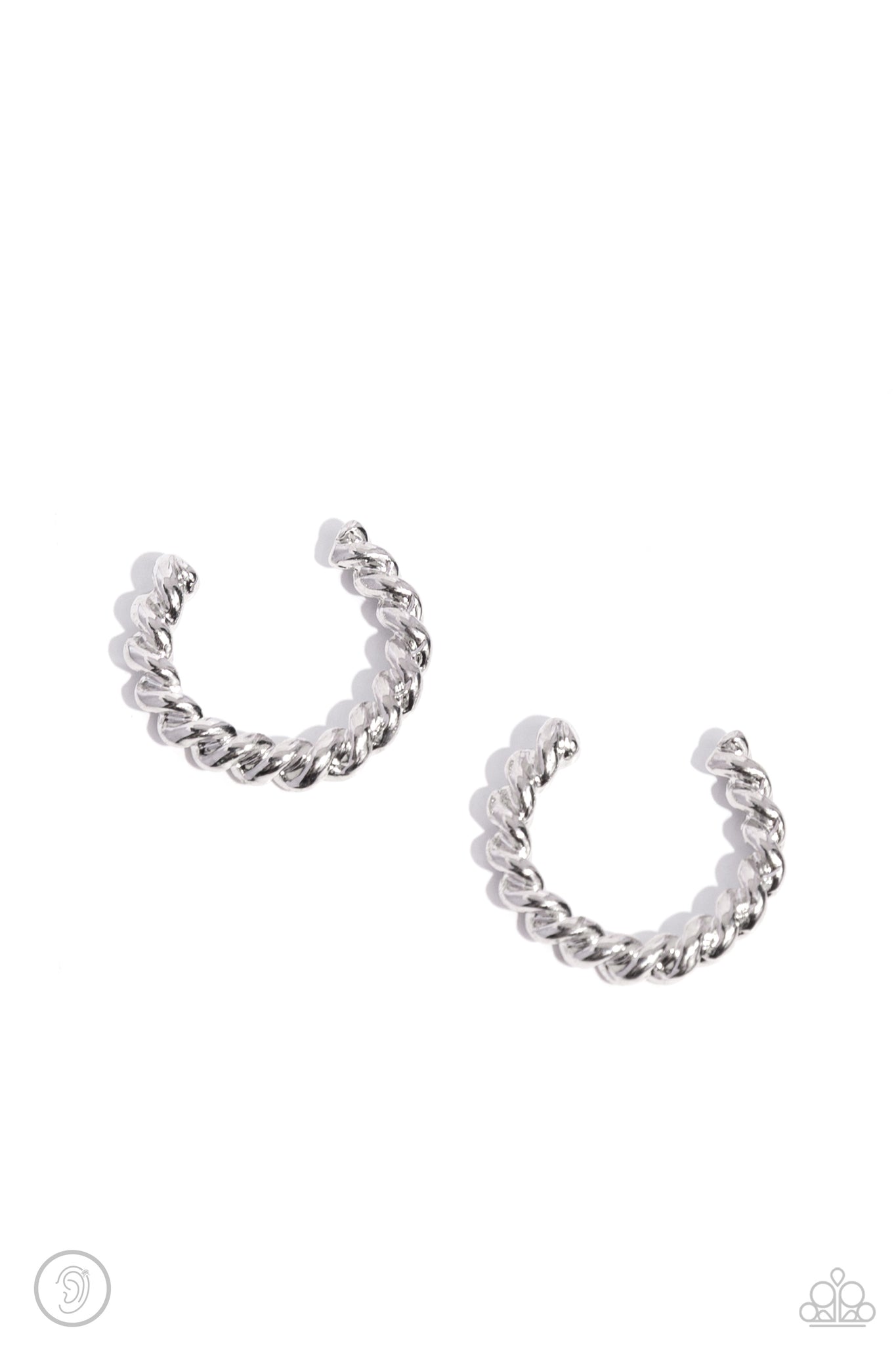 Featuring a high sheen, a thin bar of silver twists and curves around the ear to create a wreath-like, adjustable, one-size-fits-all cuff.