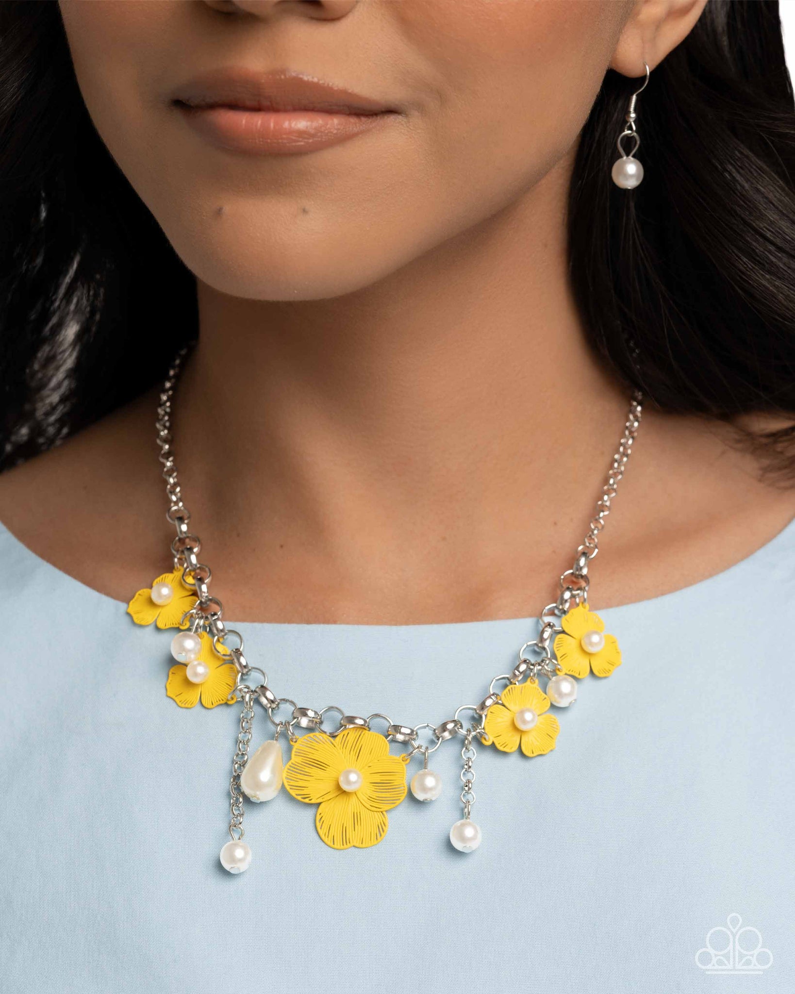 A silver chain features bright yellow-painted flowers, each highlighted with soft white pearl-like beads at their centers. Accentuating the cheerful floral motif, additional pearl-like accents and a teardrop-shaped pearl bring a playful and sunny touch to the design. Features an adjustable clasp closure.