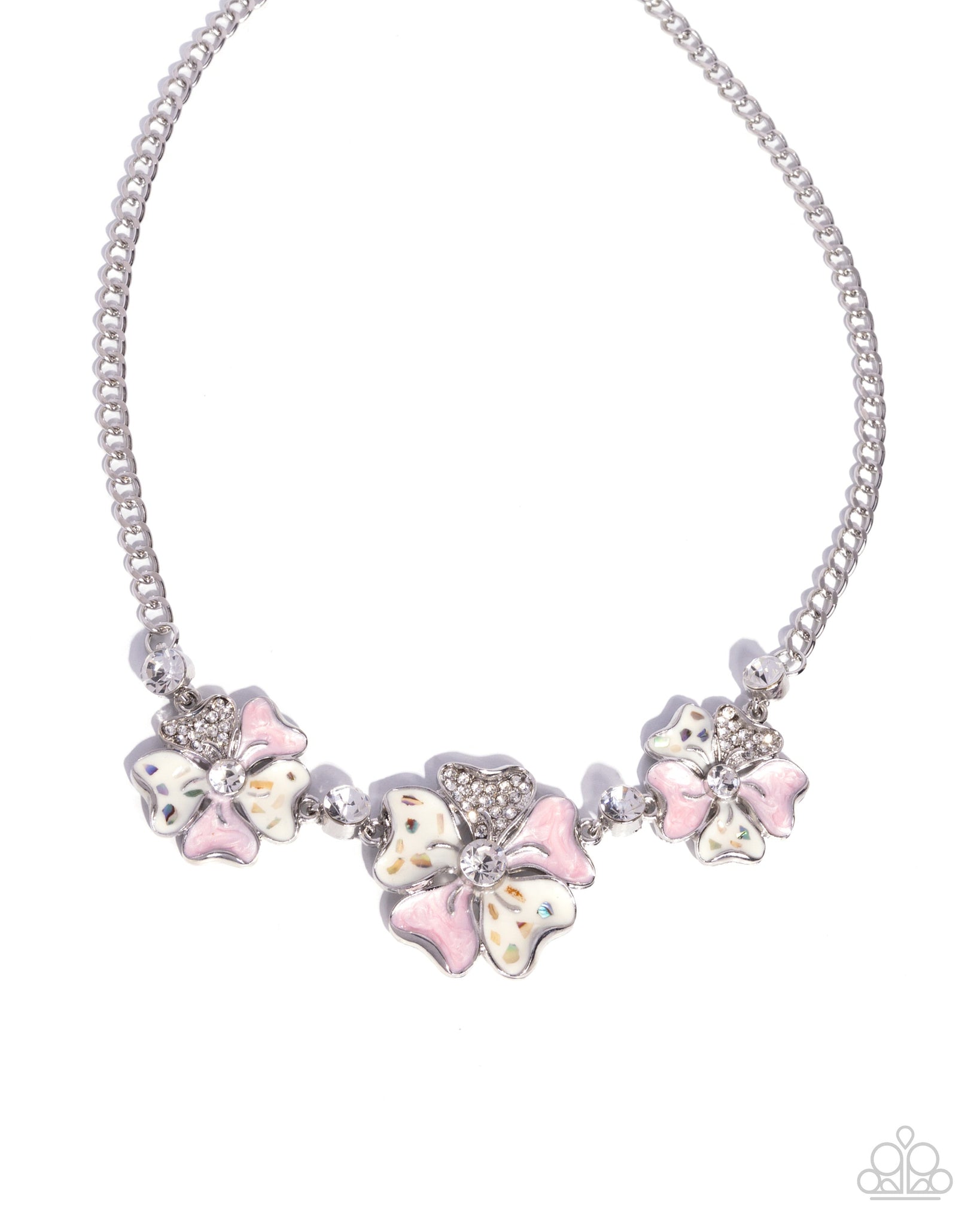 Delicate floral frames with pearly pink and white-painted petals and rhinestone-dotted centers bloom along a polished silver chain. The soft hues and sparkling details give a feminine and charming vibe, perfect for uplifting any outfit with a touch of elegance. Features an adjustable clasp closure.