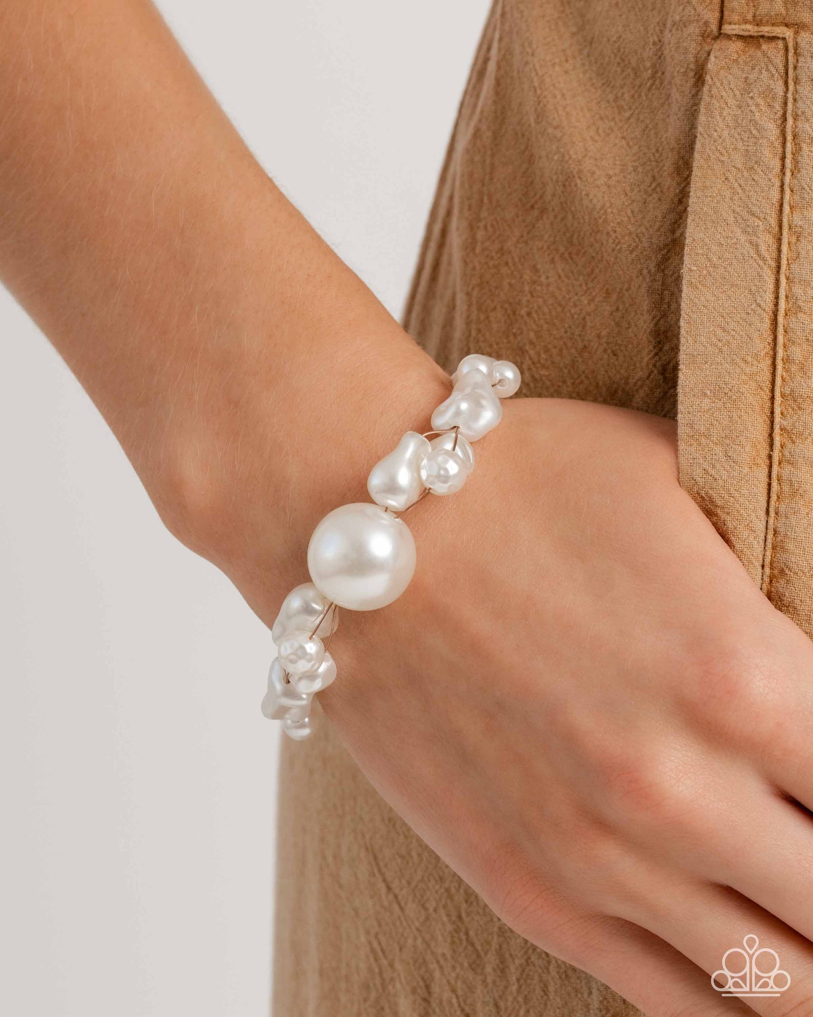 Infused along a trio of dainty copper wires, a collection of classic and baroque white pearls in varying sizes coalesce around the collar, leading the eye to an oversized round white pearl for an opulent, refined display. Features an adjustable clasp closure.